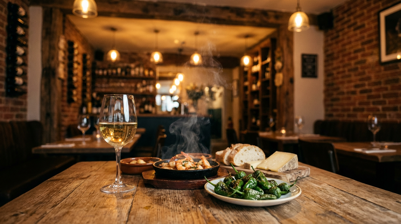 鉄板で焼ける食材の香ばしさ、タパスに添えられたハーブの余韻。